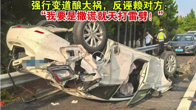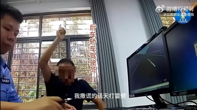 然而,事故发生后,曾某不仅认为自己无错,反而称前车司机开车摇摆,怀疑对方打瞌睡犯迷糊,诬赖对方进入自己车道撞了自己,并表示自己当时立马采取了刹车措施。现场民警发问:“能不能对自己说的话负责?”曾某信誓旦旦道:100%负责。随后,曾某妻子也给交警发信息,同样将过错全都推给对方,并要求交警:“你们要公平公正对待我们,人都要凭良心!”就在交警部门查看监控前,曾某还用手指着天说道:“我撒谎的话天打雷劈!”而面对事发时监控拍下的一幕,曾某依然声称,是前方车辆变道过来,撞到了自己的车。