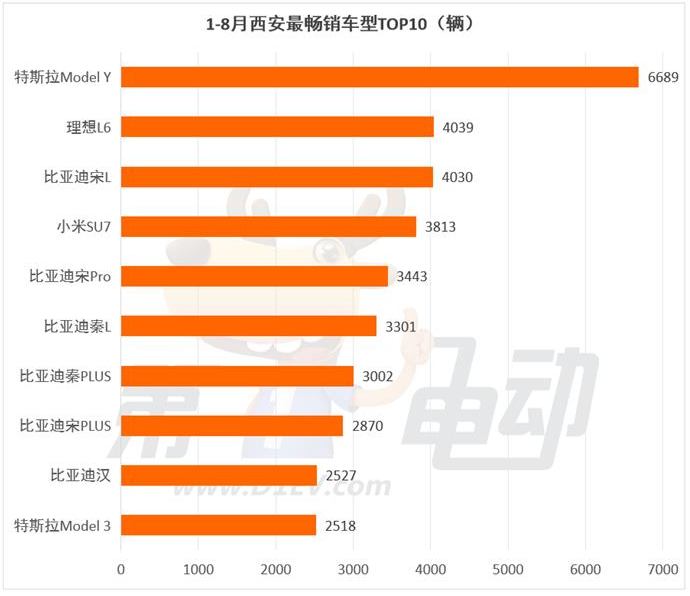 尽管比亚迪占据主导,但外来品牌凭借精准定位实现有效突围。特斯拉 Model Y以6689辆的销量登顶,成为唯一突破6000辆的车型;Model 3 虽位列第十,但仍以2518辆的销量在高端轿车市场占据一席之地,双车合计销量达9207辆,展现出特斯拉在西安高端新能源市场的稳固竞争力。小米SU7 以3813辆销量位列第四,吸引了西安年轻高收入群体,在比亚迪的 “包围” 中开辟出细分市场空间。