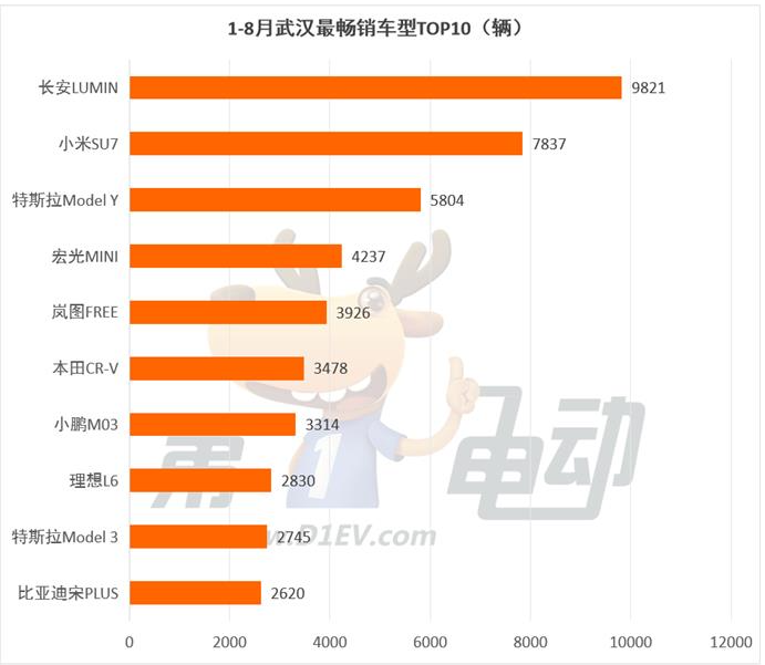 1-8月,武汉车市呈现鲜明的 “本土基因”,长安LUMIN以9821辆的销量登顶,与宏光MINI 共同占据微型代步车市场主导地位,两款车型合计销量达14058辆,占TOP10总销量的 28%。这一表现与湖北省以旧换新政策高度契合——6-10万元区间车型可享3000元补贴,而长安 LUMIN、宏光 MINI 主力价格带恰好覆盖该区间。