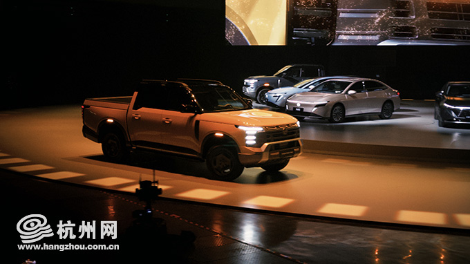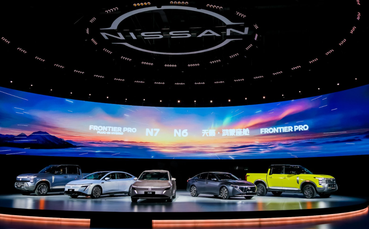 车型亮相,从左至右:Frontier Pro PHEV、N7、N6、天籁·鸿蒙座舱、Frontier Pro