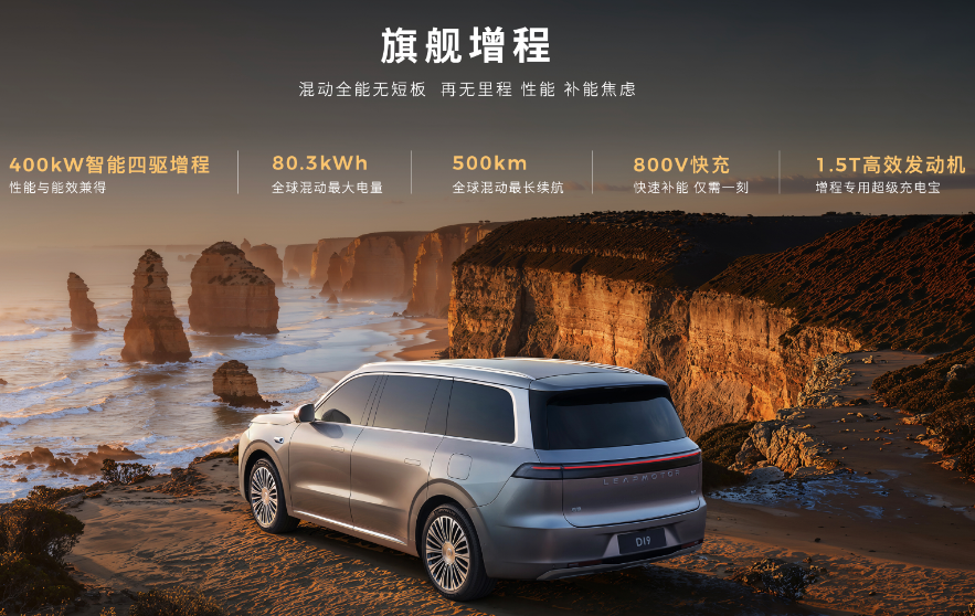 D19车长超5.2米,轴距3.1米,提供5/6/7座布局,增程与纯电双动力同步发售。增程版搭载行业最大80.3kWh电池,纯电续航突破500km;纯电版配备全球首发115kWh“超混电芯”,CLTC续航达720km,并支持千伏高压,15分钟补能350km。