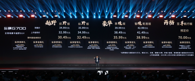 10月19日,纵横旗下首款量产车型——纵横G700正式上市,新车定位“全领域豪华越野SUV”,共推出4个版型,官方指导价为32.99万元—41.49万元,限时超级焕新价30.49万元起,并带来十大上市专属购车权益。