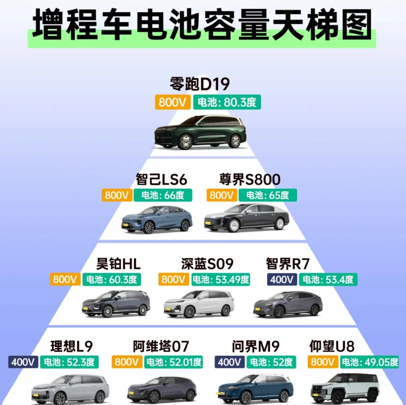 以此为背景,刚好也看到一张“增程车电池容量天梯图”,明显能够发现“做大做快”的趋势十分明显。根据目前了解到的信息,D19仅仅只是一个开始。从小鹏,到小米,到理想,再到其它主机厂,大电池增程车将会如潮水般,疯狂涌入整个大盘。