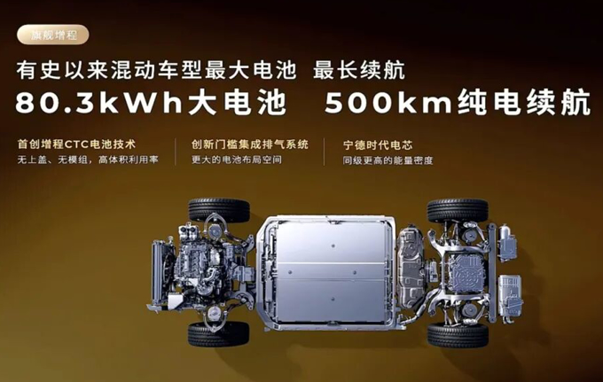同一车型,继续增程与纯电两条腿走路。前者搭载80.3度电池包,纯电续航达到500公里,并辅佐40L油箱;后者搭载115度电池包,纯电续航超700公里。