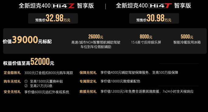 目前全新坦克400 Hi4-Z智享版、全新坦克400 Hi4-T智享版已同步开启预售,预售期间预订可享6重尊崇权益。
