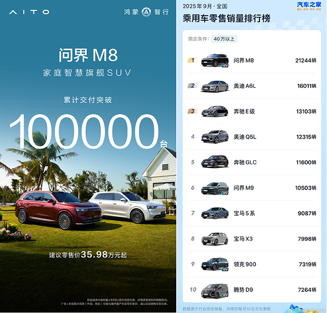 根据汽车之家9月销量榜单显示,2025年9月,问界M8以21244台的单月销量,坐拥40万元级不分车型销量榜首。自4月16日正式上市以来,问界M8仅用不到半年时间,实现累计交付量突破10万台,成为名副其实的40万元级爆款产品。这一现象级表现的背后,不仅是一款产品的成功,更是中国汽车品牌在高端市场实现价值突破的有力体现。