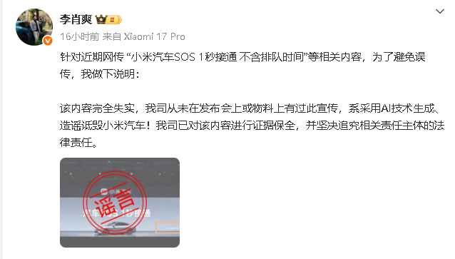 小米汽车李肖爽否认宣传“SOS1秒接通”,系AI伪造!
