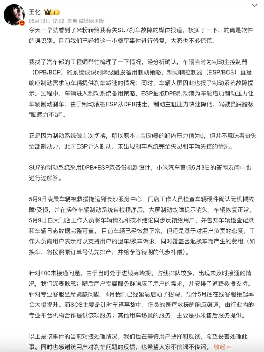 针对400未接通一事,王化表示,由于当时处于进线高峰期,占线排队较多,出现未及时接通的情况,我们深表歉意;随后用户专属服务群响应了用户的需求,并安排了道路救援支持。针对专业客服坐席紧缺问题,4月我们已经紧急启动了招聘,预计5月底在线客服接起率会大幅提升。而SOS主要是针对车辆事故中,伤员的医疗救援的响应渠道,由行业内的专业平台机构合作提供该项服务;其他用车场景的服务,主要是小米售后服务提供。