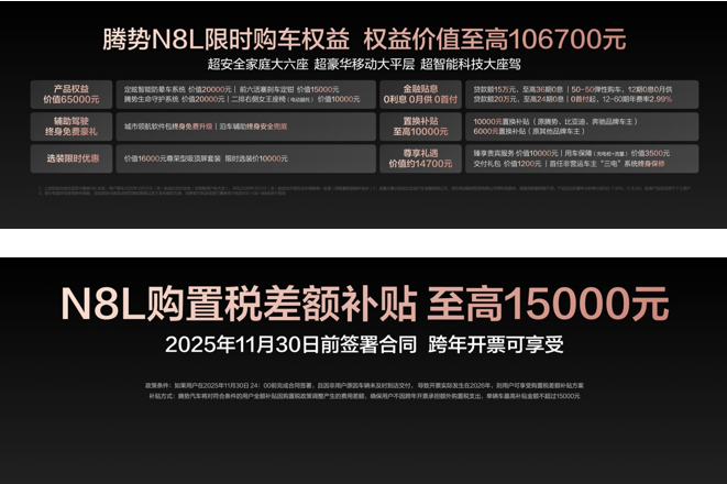 为回馈广大用户的支持与信赖,腾势N8L特别推出限时购车权益,权益价值至高10.67万元!包括价值1.7万元的三年免息,最高1万元的置换补贴。此外,不必担心因为交车晚,享受不到购置税补贴:在2025年11月30日24点前完成合同签署的用户,如果因非用户原因车辆未及时交付,导致开票实际发生在2026年,可享受购置税差额补贴,最高1.5万元!