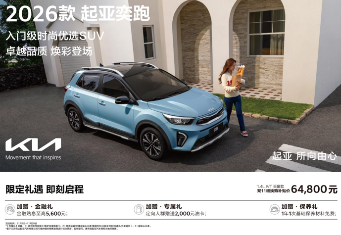 卓越品质,焕彩登场。11月1日,起亚全球高品质SUV——2026款起亚奕跑焕新上市,新车新增了天霜蓝外观配色和灰色内饰配色,共推出2款车型,其中1.4L IVT天窗款双11增换购补贴价仅64,800元。同时,购车用户还可享金融贴息至高5,600元、定向人群赠送2,000元油卡、1年1次基础保养材料免费等多项超值权益。
