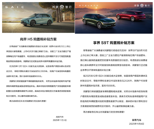 10月24日,小米汽车率先推出跨年购置税补贴方案,次日深蓝汽车发布“跨年交付购置税现金补贴方案”。