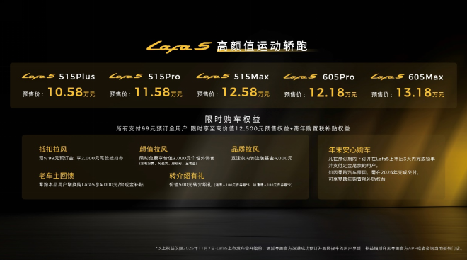 11月7日,小编从零跑汽车方面获悉,其全新运动轿跑Lafa5正式开启预售,预售价区间为10.58-13.18万元。新车基于零跑LEAP3.5技术架构打造,计划于11月28日正式上市,2026年将逐步登陆全球市场。