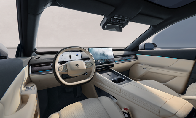 外eπ007+座舱内部采用超纤柔类麂皮绒包覆,搭配真皮加热方向盘、云感亲肌皮质座椅,在触感上传递温度。加上WANOS 2.0全景声音乐座舱、智能香氛系统及64色音乐律动氛围灯等配置,豪华感与舒适度直接拉满。