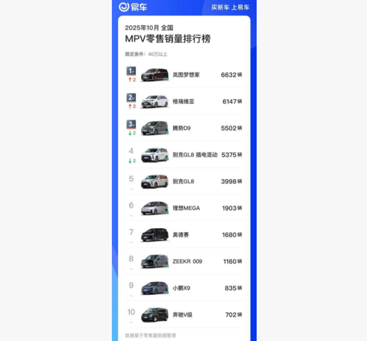 2025年10月高端MPV销量数据于11月11日公布,岚图梦想家以6632台的销量成绩位列第一。