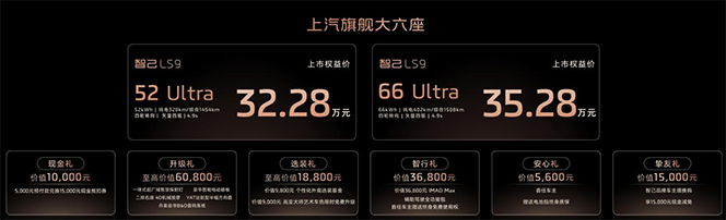 智己LS9上市权益诚意爆棚,将B&O音响系统、二排右侧4D机械按摩、一体式超广域智慧探射灯、豪华智能电动踏板等旗舰豪华配置,统统限时免费升级!新车震撼发布两个超级增程版本:智己LS9 52 Ultra版上市权益价32.28万元,入门即巅峰,以30万出头的价格,享受时代最旗舰的满配大六座;智己LS9 66 Ultra版,更搭载66度宁德时代超级骁遥MAX电池,将续航和性能推向极致,上市权益价35.28万元。