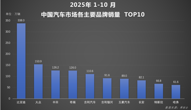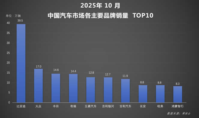 在这一浪潮中,比亚迪的领先优势愈发明显,前十月累计370万销量接近第二至第四名之和。其中,比亚迪汽车王朝网与海洋网10月销售39.5万辆,1-10月累计销量达338万辆,持续夯实规模基本盘。