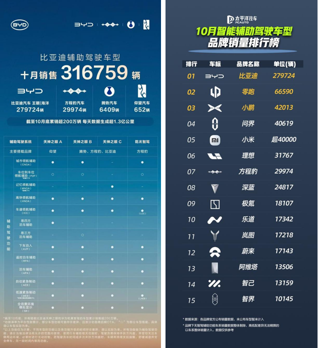 在近日发布的太平洋汽车10月智能驾驶车型品牌销量榜中,比亚迪以绝对优势位居首位,是第二名的四倍有余,领先优势显著。