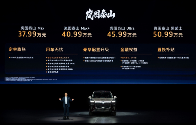 11月18日,岚图汽车正式推出旗下全新力作——岚图泰山。共推出Max版、Max+版、Ultra版、黑武士版四大版型,官方指导价为37.99万元-50.99万元。同时,还公布了总价值4.8万元的上市尊享权益。