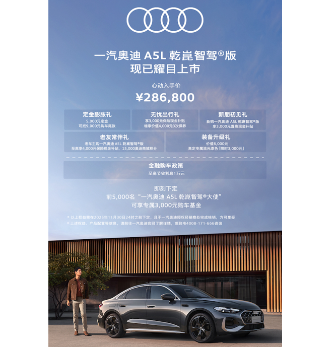 一汽奥迪A5L乾崑智驾版的专属大定权益还将延续,涵盖现金、保养、置换等丰厚限时礼遇,为用户提供高价值购车体验。2025年11月30日24时之前下定立享五重专属礼遇——定金膨胀礼:5,000元定金抵9,000元购尾款;无忧出行礼:享3,000元保险现金补贴,增享价值4,000元3次保养;新朋初见礼:新购一汽奥迪A5L乾崑智驾版享3,000元置换现金补贴;老友常伴礼:老车主购一汽奥迪A5L乾崑智驾版至高享4,000元保险现金补贴;装备升级礼:限时3,000元可享价值6,000元高定专属流光漆色;一汽奥迪还为用户提供专属金融购车政策,至高节省利息1万元;此外,前5000名“一汽奥迪A5L乾崑智驾大使”可享专属3,000元购车基金礼遇。