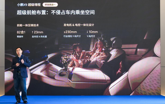 小鹏X9超级增程前舱布局紧凑,在不压缩座舱乘坐空间的前提下,小鹏汽车与华为选择通过发电机与电控的高集成度设计,将发电机Y向尺寸极致压缩至≤230mm。结合小鹏汽车的前舱一体压铸技术,实现零部件82合⼀,总内空X向⻓度提升23mm,共同实现了前舱空间利用率的行业突破。