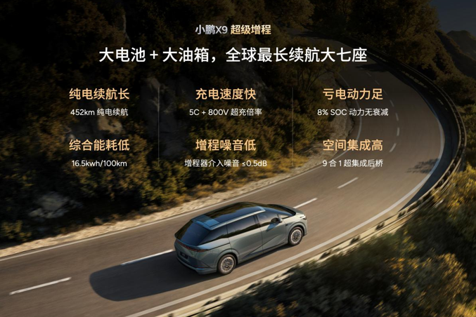 作为鲲鹏超级增程技术的颠覆之作,小鹏X9超级增程以“超快充大电池+大油箱”组合,重新定义下一代增程。同时,作为一款面向全球家庭用户的增程AI大七座,小鹏X9超级增程对其动力系统提出极高标准,分别为“纯电续航长、充电速度快、亏电动力足、综合能耗低、增程噪音低、空间集成高”,这要求在架构设计上实现一车双能且不侵占车内乘坐空间,续航上能够兼容5C超快充高压大电池+大油箱,动力上实现同级领先的大七座发电与保电能力,在传统增程最关键的静谧槽点上要求降噪NVH≤0.5dB(A),做到完美融合纯电体验的优势与无感增程的从容,为全球用户打造“下一代增程”体验。