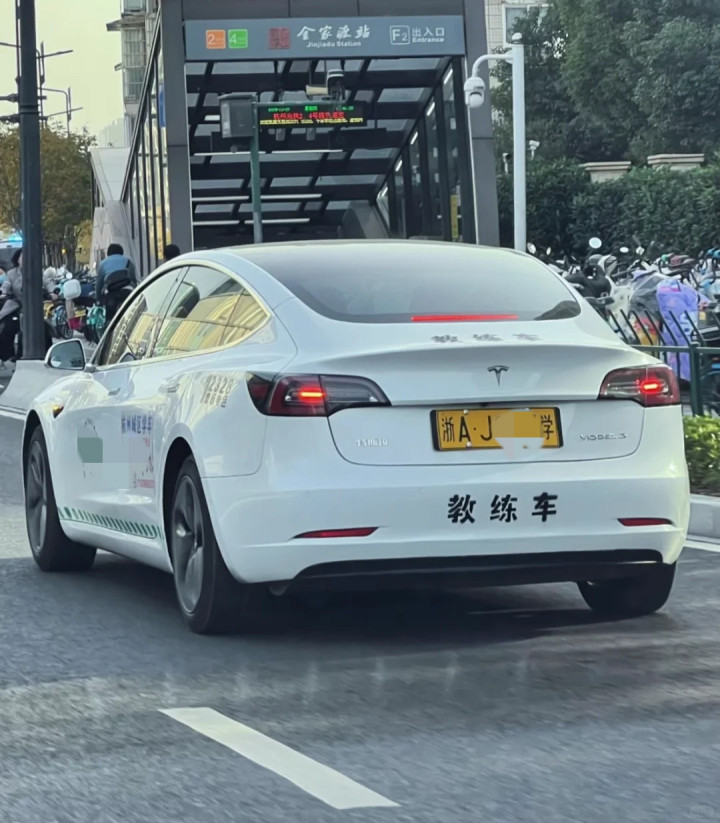 照片显示,一辆白色特斯拉model 3 在路上行驶,黄色号牌“浙J**3学”和 “教练车”字样格外显眼。