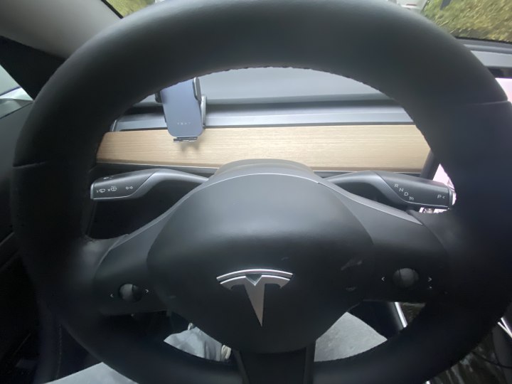 下午,记者实地体验了这款特斯拉,主驾位置方向盘左侧下方设置远近灯光以及雨刷功能,右侧为为P、R、N、D档位。