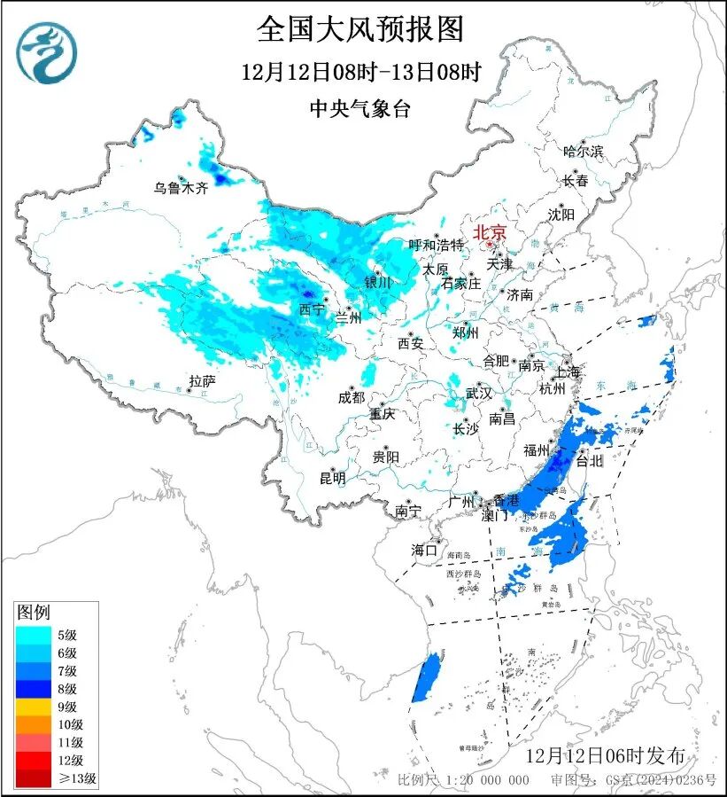 中央气象台12月12日继续发布暴雪蓝色预警、大风蓝色预警、寒潮蓝色预警。预计,12月12日08时至13日08时,甘肃中部、内蒙古河套地区、陕西东部、山西、河北西部、北京西南部、河南、山东西南部等地部分地区有大雪,其中,山西西部、河南南部等地局地有暴雪(10~15毫米),上述部分地区新增积雪深度5~10厘米,局地可达12~18厘米。新疆北部、青海、西藏北部、内蒙古西部、四川北部、甘肃东部、宁夏、陕西西北部等地部分地区有5~7级、阵风8~9级的大风,其中,新疆山口地区阵风可达10~11级;东海南部部分海域、台湾海峡、巴士海峡、南海东北部和中东部部分海域将有7级、阵风8~9级的大风。