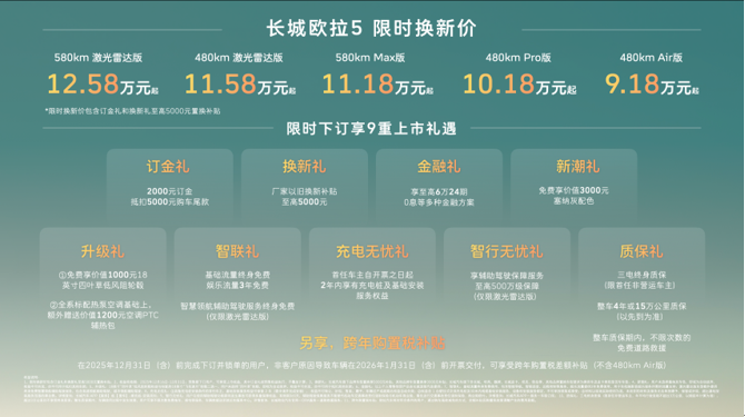 12月16日,长城汽车欧拉品牌全新A级纯电SUV——长城欧拉5正式上市。新车共推出5款配置,建议零售价区间为9.98万至13.38万元,限时换新价9.18万元起(限时换新价包含“订金礼”和“换新礼”至高5000元以旧换新补贴)。即日起至2025年12月31日,用户下订并锁单即可尊享包含订金礼、换新礼、智行无忧礼在内的9重上市好礼,以及跨年购置税补贴(不含480km Air版)等丰厚购车权益。