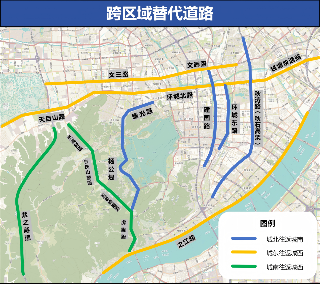 12月31日21时起,中河高架庆春路双向下匝道关闭,机动车请绕行环北立交、体育场路下匝道、涌金立交佑圣观路下匝道驶离高架;环城西路北山街路口往南禁止驶入环城西路辅道(可进入西湖隧道),机动车请提前绕行保俶路、凤起路。城北往返城南区域的可通过建国路、环城东路、曙光路-杨公堤-虎跑路-钱塘江大桥、秋涛路-秋石高架通行;城东往返城西区域的可通过环城北路(钱塘快速路)、文晖路-文三路、之江路-之江东路通行;城南往返城西区域的可通过之江路-虎跑路-五老峰隧道-吉庆山隧道-九里松隧道-灵溪隧道、紫之隧道通行。