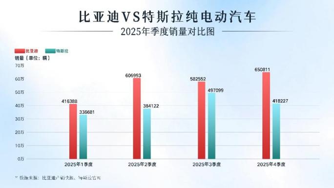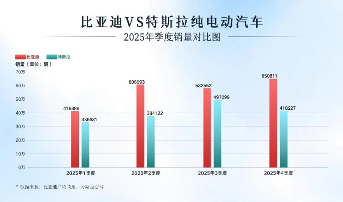 此次超越不仅体现在年度总销量上。市场数据显示,在2025年的四个季度中,比亚迪的全球纯电销量均持续领先于特斯拉,这已是其连续第五个季度实现季度销量超越。这一趋势表明,比亚迪的领先地位并非偶然,而是其综合竞争力持续释放的结果。