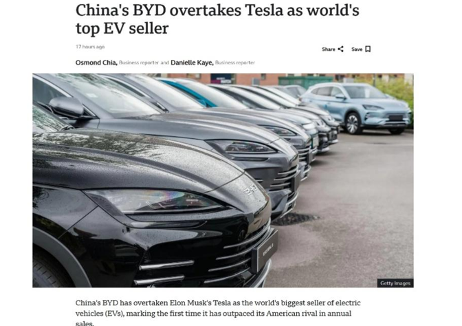 英国媒体BBC报道:中国比亚迪超越特斯拉成为电动汽车销冠