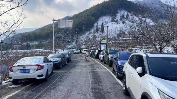 “山里太冷,游客爬山下来,大巴车还没上来,都想着尽早下山,就找当地人开的皮卡或农用车,现场人多车多,警察在控制上山下山的车辆,如果不控制拥堵会更厉害,给警察叔叔点赞,辛苦了。”