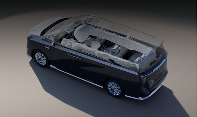 被动安全方面,采用“八纵十九横”车体结构,高强度钢占比高达85.6%,打造坚实的笼式铠甲车体。针对MPV第三排安全痛点,首创1.5米后风窗气囊,与两侧6.4米超长侧气帘,形成360°环抱式气囊矩阵,构筑刚柔并济的全向安全堡垒。
