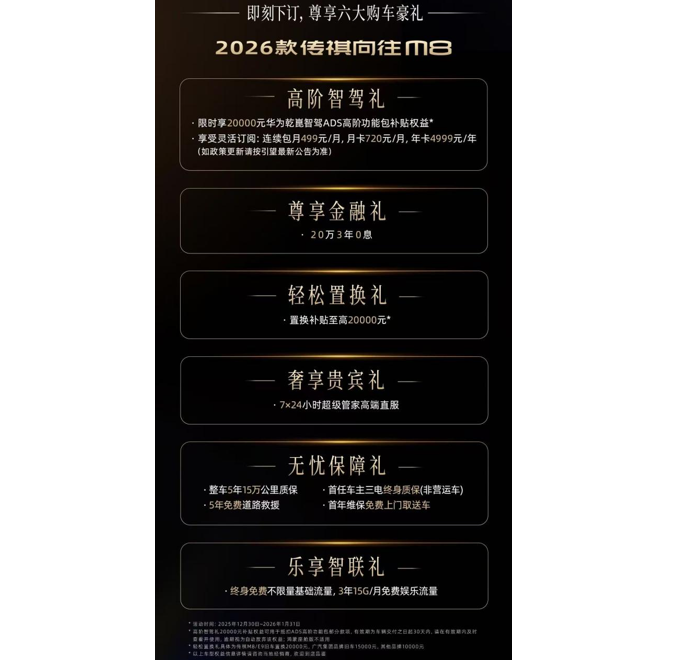 2025年12月30日,正值传祺M8上市八周年之际,2026款传祺向往M8感恩上市,新车上市指导价30.99万元起,限时补贴价仅28.99万元起。为回馈广大用户的长期信赖与支持,即日起下订即可尊享六大专属礼包:置换补贴至高20000元、限时享20000元华为乾崑智驾ADS高阶功能包补贴权益,以及20万3年0息金融礼等丰厚权益。