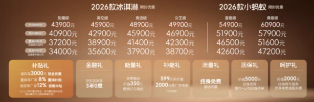 2026款奇瑞冰淇淋推出四个版本车型,售价分别为:女王版38700元起、竞速版37900元起、英伦版35600元起、甜趣版34000元起。新款小蚂蚁推出271km喜爱版与271km真爱版两款车型,续航较此前提升20km,售价为真爱版47200元起、喜爱版42600元起。
