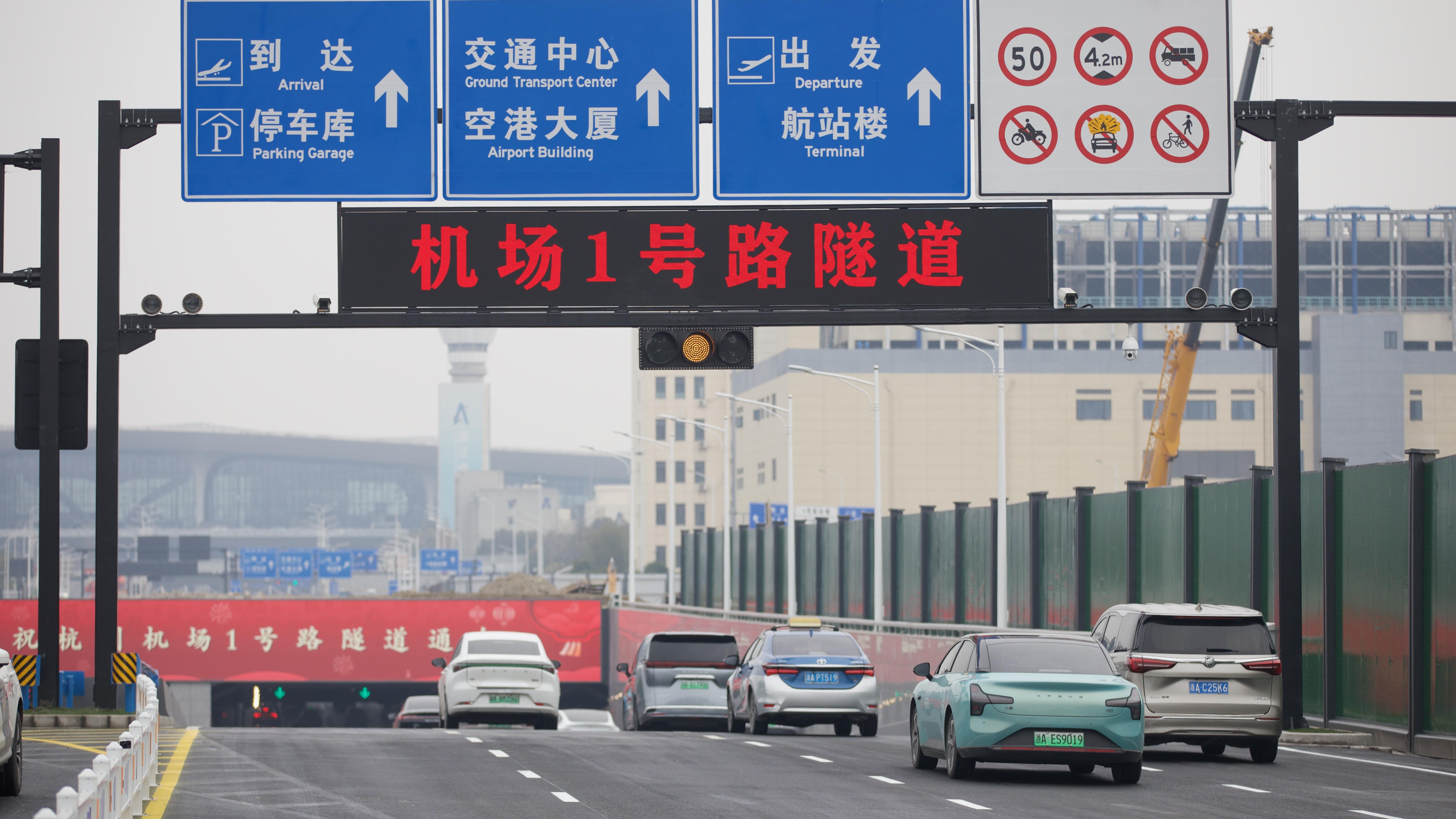 1月28日12时,杭州萧山国际机场1号路隧道通车试运行。机场1号路隧道全长约485米、双向八车道、限高4.2米,实行24小时全天候开放通行,设计速度为50公里/小时。