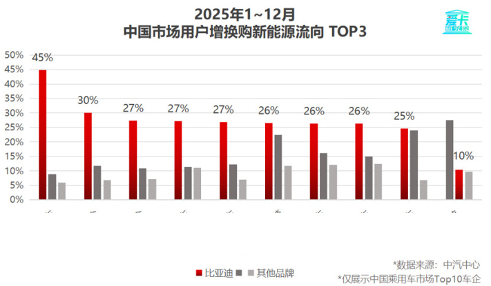更关键的是,比亚迪在新能源增换购市场形成强大“虹吸效应”,无论是比亚迪自身老车主,还是主流合资、自主品牌车企用户,在置换新能源车型时,均将比亚迪列为首选品牌。在国内乘用车市场TOP 10车企用户中,平均每4个增换购新能源的用户里,就有1个投向了比亚迪,这一数据不仅佐证了比亚迪在新能源增换购市场的统治力,更彰显其作为置换新能源核心品牌的实力。