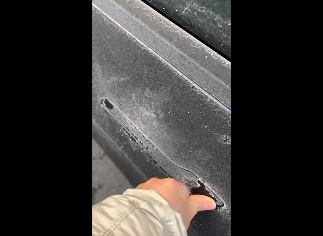 萧山一网友在萧内网App晒出一段视频,早上出门发现车门打不开,被冻住了,他说取消隐藏门把手是对的——