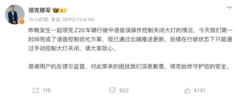 穆军确认了该车型在行驶中确实发生了语音控制关闭大灯的误操作情况,并表示公司技术团队已于今日第一时间完成了语音控制优化方案的制定。
