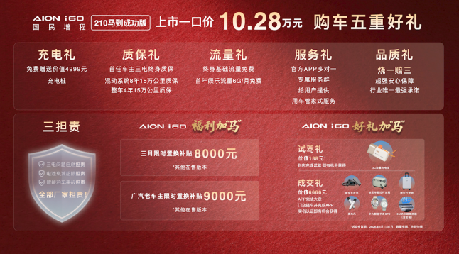 此外,该车提供“烧一赔三”及“三担责”保障,涵盖三电问题自燃、电池衰减超限、智能泊车事故等场景。埃安同时推出3月限时置换补贴,i60其他在售版本置换补贴8000元,广汽老车主置换补贴9000元。