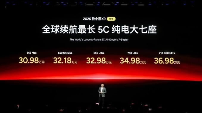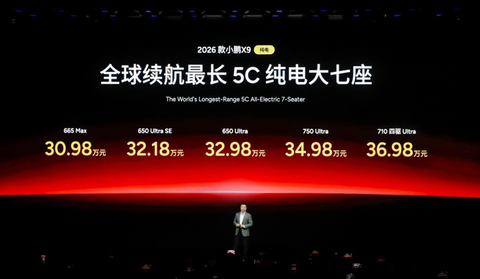 2026款X9纯电版共5款配置:分别是售价30.98万元的665 Max版、32.18万元的650 Ultra SE版、32.98万元的650 Ultra版、34.98万元的750 Ultra版和36.98万元的710 四驱 Ultra版。