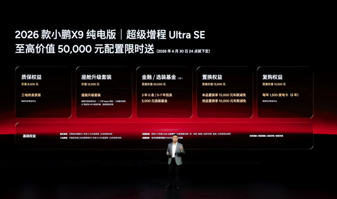 即日起至4月30日,下定2026款X9纯电版可享最高价值5万元权益,包括三电终身质保、价值1.2万元的座舱升级套装、至高3万元金融/选装基金、至高1.5万元置换权益以及每年1500度电卡(6年)的复购权益。