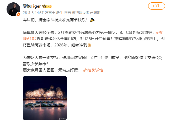 3月4日消息,零跑汽车COO徐军于近日在微博宣布,旗下全新小型SUV车型零跑A10将于3月26日开启预售。重磅旗舰D系列也在路上,即将登陆高端市场。
