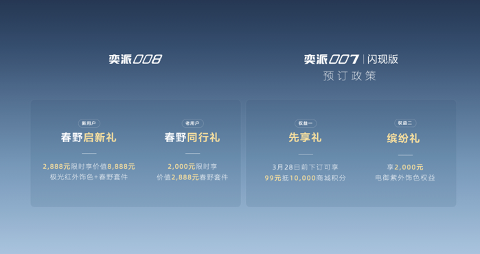 奕派008“极光红”全新车色由东风奕派与用户共创,并携手中国国家地理将阿勒泰红色极光复刻于车身,车漆质感通透且抗刮耐磨。以车顶横杆行李架+固定侧踏板+放电插排为组合的“春野套件”。为回馈新老用户支持,推出限时购车权益,新用户下订极光红外饰色绑定春野套件限时先享价2888元;老用户可在APP下订春野套件,限时回馈价2000元。此外,奕派008即将全系推送OTA升级。