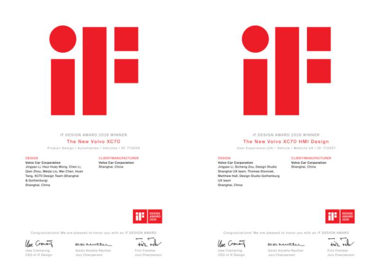 近日,2026年iF设计大奖评选结果揭晓,沃尔沃全新XC70从全球66个国家/地区的超11000件参赛作品中脱颖而出,其整车设计与HMI设计一举斩获两项iF设计大奖。该车将斯堪的纳维亚设计美学、人性化智能科技与超混安全性能相融合,定位为“安全超混旗舰”车型。