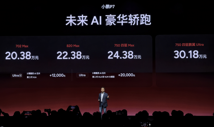 3月18日,小鹏「爱P7的鹏友大聚会」上,小鹏P7带来了星曜红、暗夜黑、星云白三款全新外观色,并搭载小鹏最新的第二代VLA。同时,小鹏P7新增Max、Ultra SE两大版本。小鹏P7官方指导售价20.38万元起。其中,702 Max版20.38万元、820 Max版22.38万元、750四驱Max版24.38万元、750四驱鹏翼Ultra版30.18万元。在Max版基础上,加1.2万元即可升级为搭载2颗图灵AI芯片+第二代VLA的Ultra SE、加2万元可升级为搭载3颗图灵AI芯片+第二代VLA和VLM大模型的Ultra。