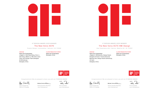 近日,小编从沃尔沃官方获悉,在刚刚揭晓的2026年iF设计大奖评选中,沃尔沃全新XC70凭借卓越的产品实力,从全球66个国家/地区超11,000件参赛作品中脱颖而出。其整车设计与HMI设计一举斩获两项iF设计大奖。