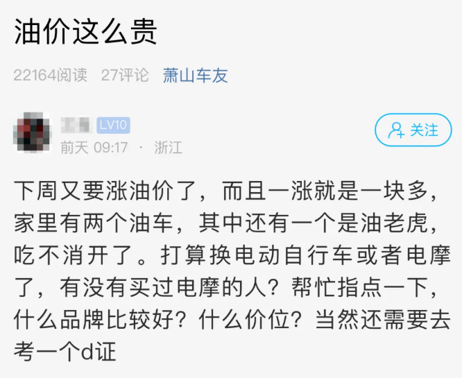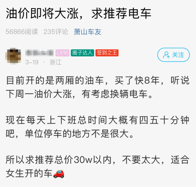 最近,萧山不少网友在萧内网App发帖说,油价这个涨势,打算换电车了。