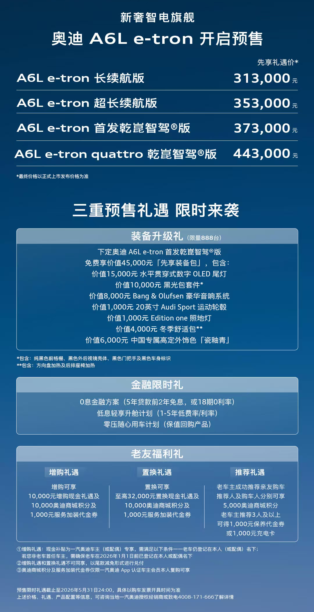 发布会上,基于PPE豪华纯电平台打造的奥迪A6L e-tron同步开启预售,预售价格31.3万元-44.3万元,对应的预售权益一并上线。